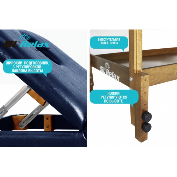 Профессиональное оборудование гарантирует комфорт клиента в течение сеанса. Предусмотрена настройка высоты, наклона подголовника, есть вырез для лица. На ножках сделана полка для аксессуаров массажиста.