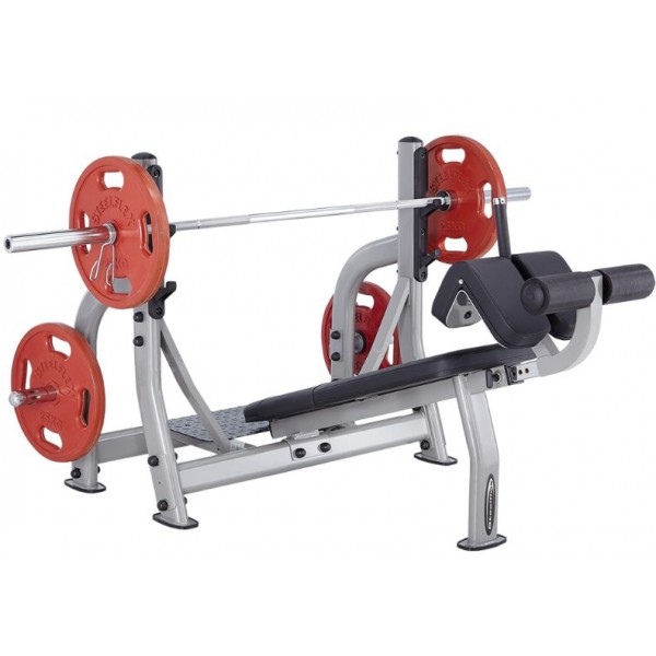 Steelflex NODB – профессиональный тренажер для выполнения в спортзале жима лежа, скамья находится под отрицательным наклоном. Ограничение веса спортсмена – 120 кг.