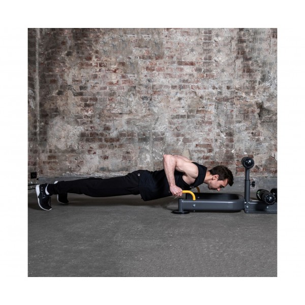 Модель имеет удобные поручни из прочной стали длиной 20 см. Валики установлены на высоте 12,5 см от платформы с рифленой поверхностью, что позволяет заниматься в комфортной спортивной обуви любого типа.