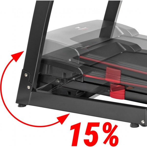 Двигатель концерна Fuji (Япония) с пиковой мощностью 5,1 л.с. обеспечивает бег со скоростью до 18 км/ч. Ширина бегового полотна составляет комфортные 47 см. Увеличить наклон можно до 15% (электрическая регулировка). Дорожка имеет высококачественную систему амортизации с использованием комплектующих коммерческого класса. На поручнях вмонтированы датчики проверки пульса.