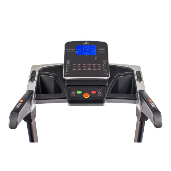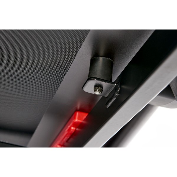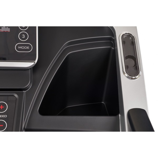Тренажер имеет прочную деку и мощный японский мотор Fuji, которые гарантируют скорость спортсмена до 16 км/ч. Наклон полотна можно изменить до 15 градусов, а скорость движения регулируется прямо на поручне, возле встроенных датчиков пульса. Есть улучшенная система амортизация для уменьшения влияния на суставы.
