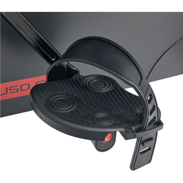 Тренажер имеет 24 уровня электромагнитного сопротивления, есть регулировка в Ваттах. Устойчивая конструкция включает тяжелый сбалансированный маховик и 3-х компонентный педальный узел. Производитель использует в тренажере высококачественные подшипники и кевларовый ремень.