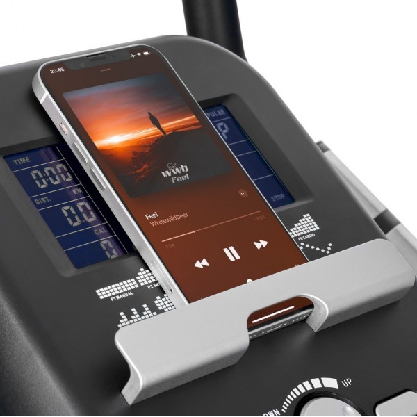 В тренажере установлен маховик 11 кг и 3-х компонентный педальный узел. Инженеры бренда создали сбалансированную приводную систему с равномерным сопротивлением без провалов. Спортсмену доступен выбор 16 уровней нагрузки. Положение руля регулируется в круговом диапазоне, седло настраивается в двух плоскостях. Есть датчики контроля пульса на поручнях руля и подставка под смартфон.