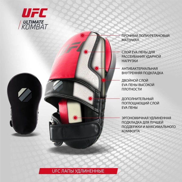Лапы UFC имеют удлиненную форму и произведены американским брендом для домашних тренировок. Благодаря длине подойдут для ударов ногами, не только руками. Предплечье имеет защиту слоями пены, а над пальцами предусмотрит специальный козырёк. Для фиксации на руке используется липучка.