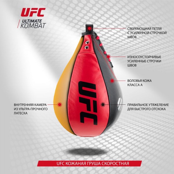 Груша UFC - модель для развития скоростной реакции и координации. Продукция профессионального класса от знаменитого американского бренда выполнена из натуральной кожи и других высококачественных материалов.