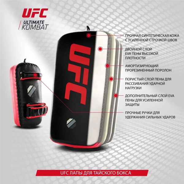 Лапы UFC для тайского бокса разработаны американским брендом для интенсивных домашних тренировок. Изделие имеет жесткую ручку и усиленную прошивку, что позволяет выдерживать удары разными частями тела.