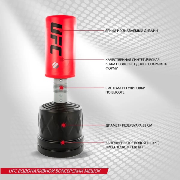 Водоналивной боксерский мешок UFC выпускается известным американским брендом для эффективных домашних занятий. Его нижнюю часть можно заполнить водой или же песком.