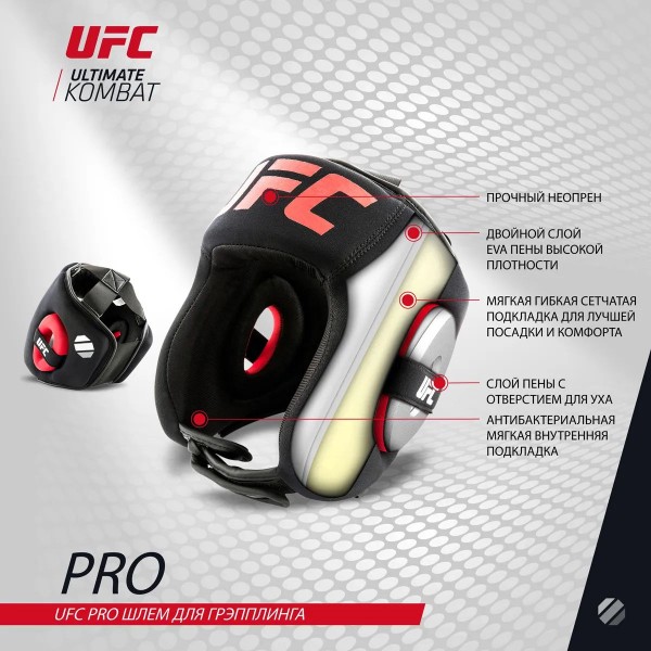 Шлем UFC выпускается американским брендом для грэпплинга. Удобная и надежная конструкция для профессиональных спортсменов включает нескользящую подкладку и удобную регулируемую застежку.