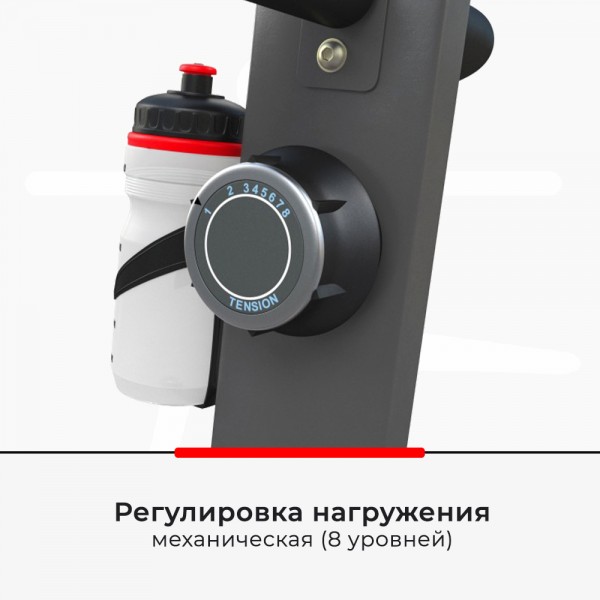 Магнитная нагрузка позволяет вручную выбрать один из 8 уровней сложности. Модель использует маховик весом 9 кг и трехкомпонентную педальную систему. Удобное сидение можно настроить по горизонтали и вертикали для людей разного роста. Ограничение по весу пользователя – 130 кг.