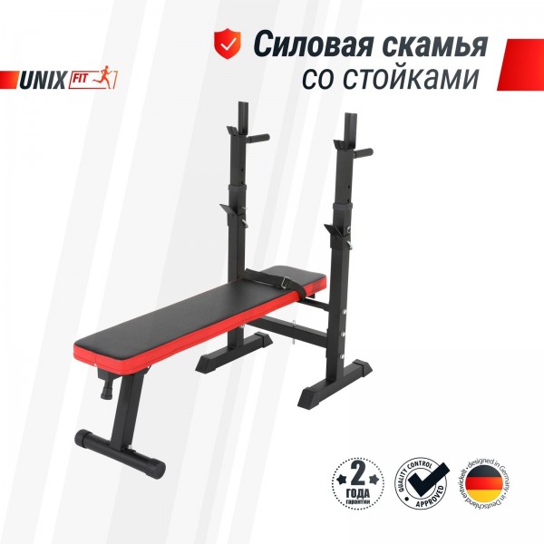 Unixfit BENCH 125 – надежная силовая скамья со стойками для занятий со свободными весами, которая выдерживает вес до 240 кг на скамью и до 120 кг на стойки.