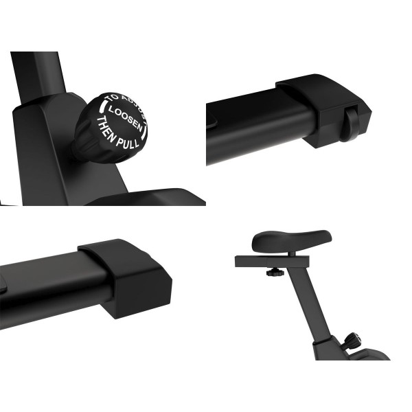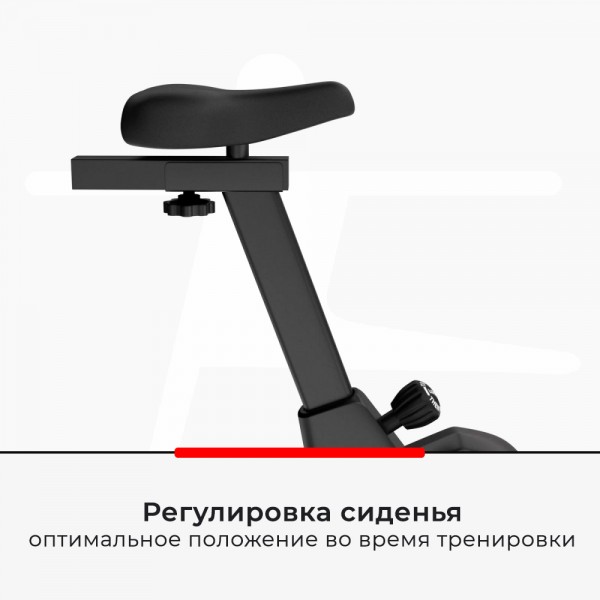Велотренажер оборудован сбалансированным маховиком для создания плавного хода. Комфортная посадка достигается регулировкой положения седла в двух плоскостях, также есть настройка фиксаторов на педалях. Датчики проверки пульса встроены на поручни руля.