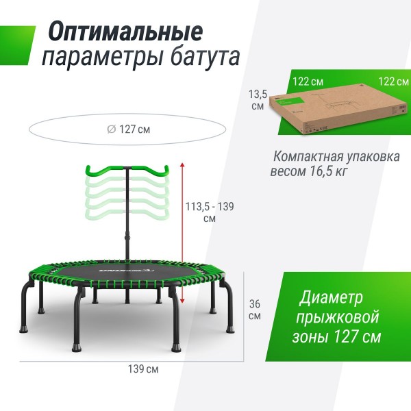 Батут выполнен на основе стали толщиной 1,5 мм и надежного эластичного жгута в роли пружин (40 переплетов). Удобная ручка имеет 5 уровней высоты (113,5-139 см). Прыжковое полотно из Перматрона имеет восьмиугольную форму, восемь опор и дополнительная перекладина обеспечивают отличную устойчивость батута.