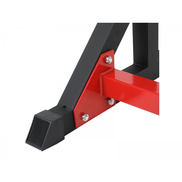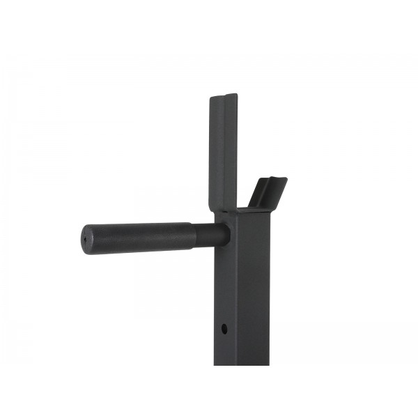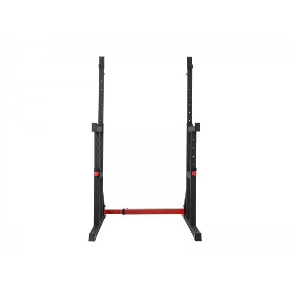 Стойка выполнена из прочного профиля и предлагает возможность изменения высоты. Предусмотрены специальные страховочные крюки, их высоту также можно регулировать. Компактные габариты модели подойдут для большинства квартир. Установлены накладки на опоры для предотвращения скольжения по полу.
