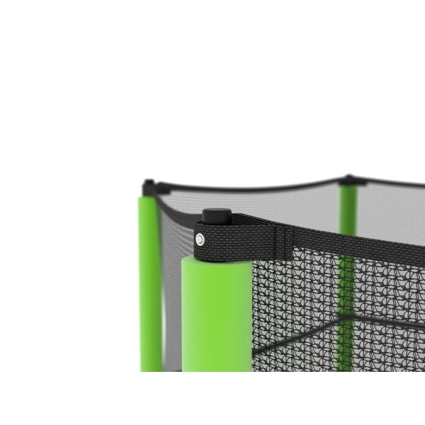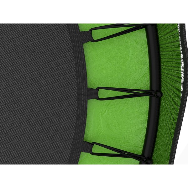Прыжковое полотно изготовлено из современного Перматрона и фиксируется на каркасе тридцатью жгутами-пружинами. Защитный мат закрывает пружинный блок. Конструкция имеет верхнюю и нижнюю защитную сеть, вход внутрь закрывается на молнию.
