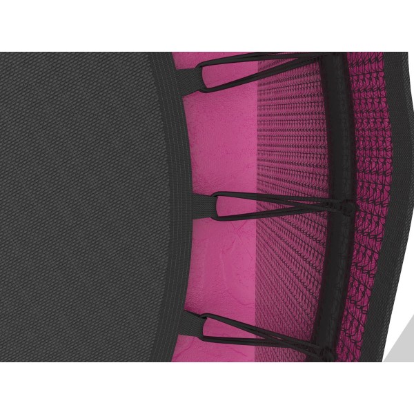 Прыжковое полотно изготовлено из современного Перматрона и фиксируется на каркасе тридцатью жгутами-пружинами. Защитный мат закрывает пружинный блок. Конструкция имеет верхнюю и нижнюю защитную сеть, вход внутрь закрывается на молнию.