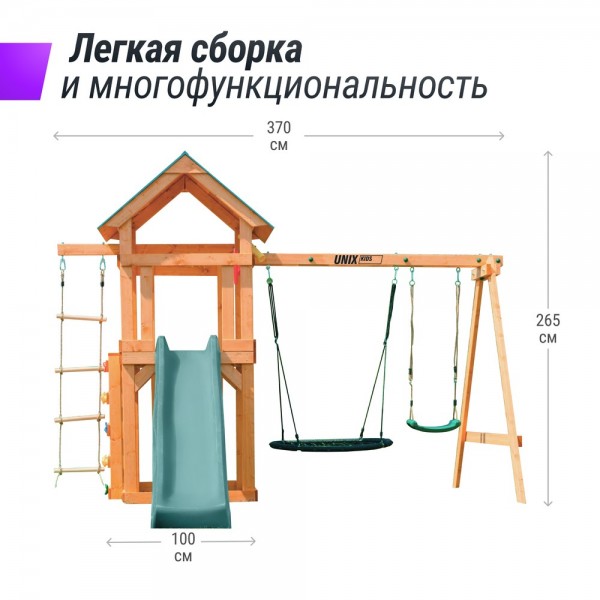 UNIX Kids (6 in 1) рассчитан на детей от трех лет (нагрузка до 100 кг). Такой игровой комплекс может быть установлен на даче или загородной участке, бетонирование не требуется.