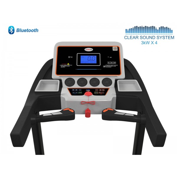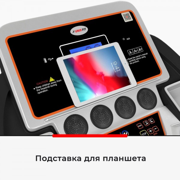Консоль включает 15 программ тренировки, есть BodyFat. Через Bluetooth происходит синхронизация со спортивным приложением. Встроены 4 динамика, есть аудио-разъем и USB порт. На экране в ходе забега можно увидеть: