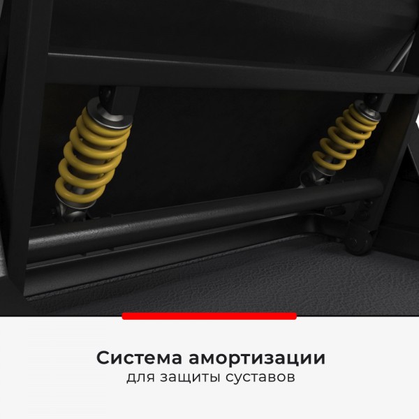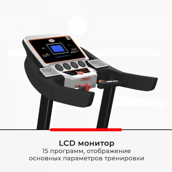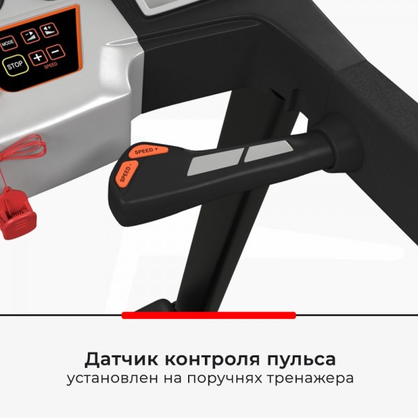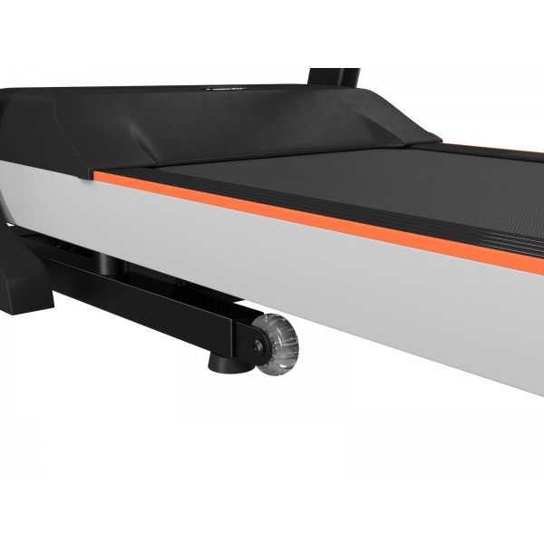 Прочная рама и дека толщиной 18 мм обеспечивают возможность тренировки спортсменам весом до 140 кг. Здесь установлен надежный двигатель с пиковой мощностью в 4 л. с., при этом скорость движения может составлять до 16,8 км/ч. Современная система амортизации значительно уменьшает вредное ударное воздействие на суставы. Наклон полотна меняется кнопками до 15%. Контроль пульса осуществляют датчики на поручнях, там же можно менять скорость тренировки. Использование гидравлики позволяет легко сложить тренажер.