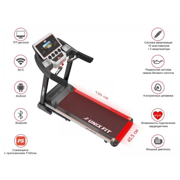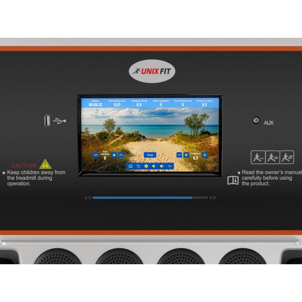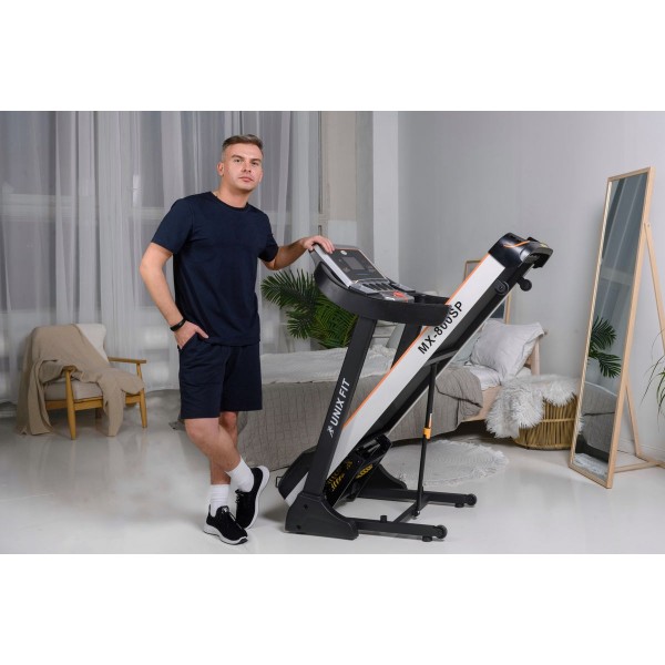 Unixfit MX-800SP - надежный современный тренажер для дома с широкими мультимедийными возможностями. Беговая дорожка имеет ограничение веса 140 кг.