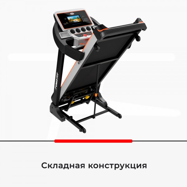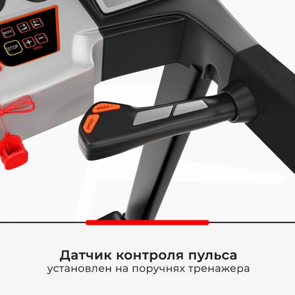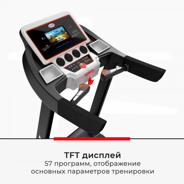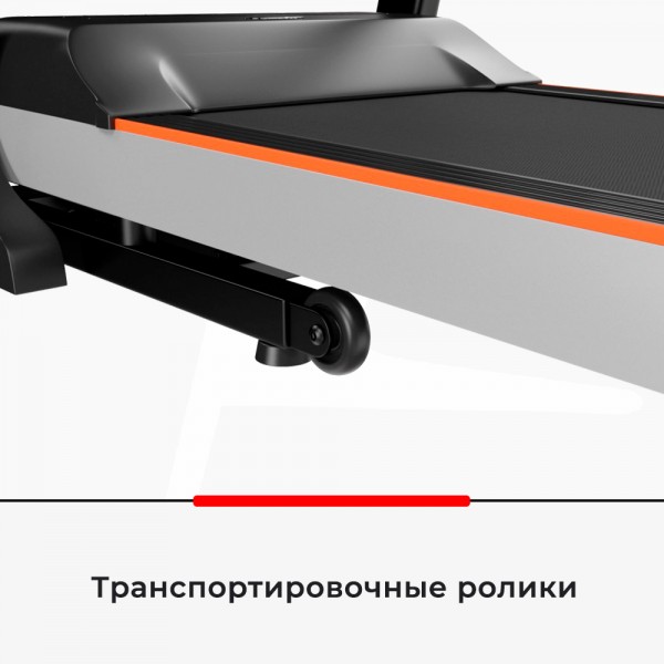 Модель основана на усиленной раме и мощном моторе в 3 л.с., обеспечивающем скорость бега в 16,8 км/ч. Беговое полотно выполнено с антискользящим покрытием. Есть возможность увеличить угол наклона электронно. Изменение скорости и угла вынесены на поручни, там же есть датчики проверки пульса. Амортизация полотна снижает вредное воздействие на позвоночник и суставы. Дорожку можно сложить, чтобы тренажер занимал меньше места в комнате.