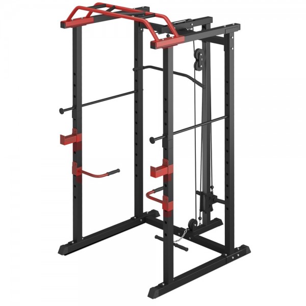 Модель позволяет выполнять упражнения на турнике с разным хватом, а также есть верхний и нижний блок. Страховочные крюки для штанги можно переставлять по высоте. Тренажер имеет съемные брусья.