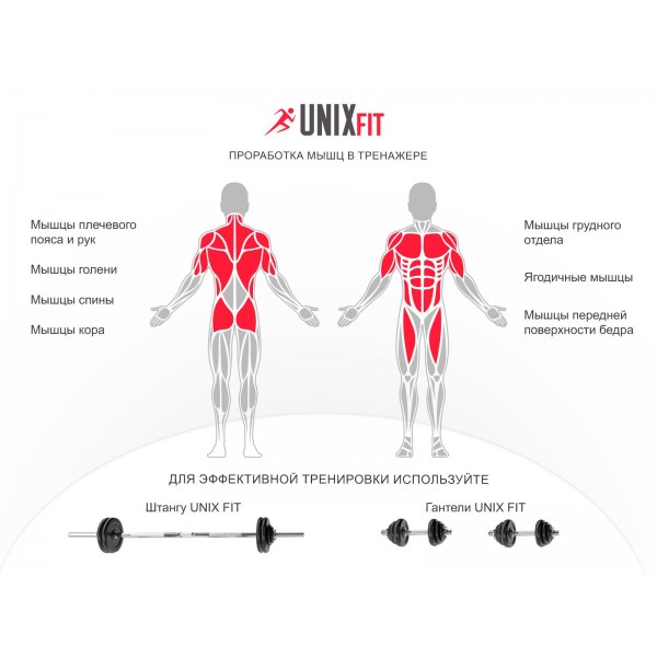 Тренажер выполнен на раме из усиленного стального профиля. Пользователю доступны: