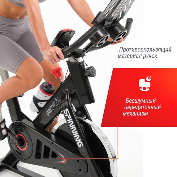 Unixfit SB-620 PRO - спинбайк с подключением к приложению FitShow и маховиком 13 кг. Параметры тренажера рассчитаны на вес спортсмена до 130 кг и рост до 195 см.