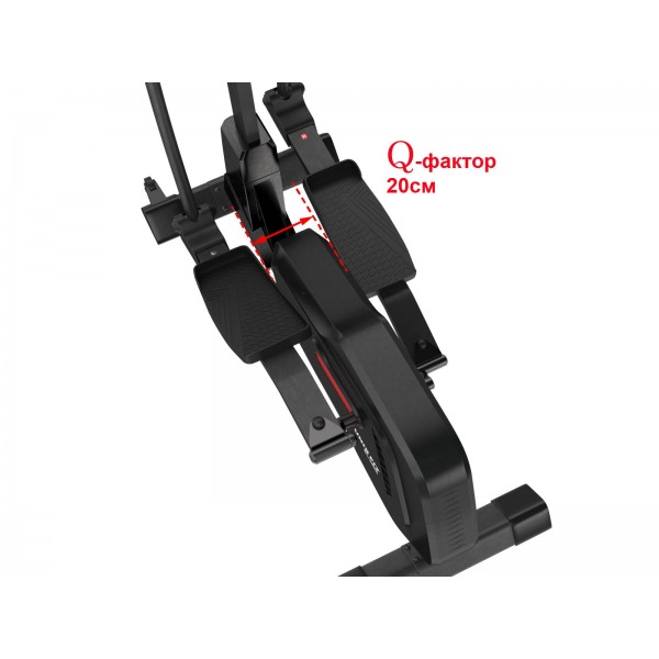 Орбитрек оснащен маховиком 22,5 кг (вес инерционный) и основан на особопрочной раме. Длина шага данной модели составляет 41 см, а межпедальный интервал - 20 см. Есть проверка пульса. Максимальная нагрузка - 600Вт, есть выбор из 16 вариантов.