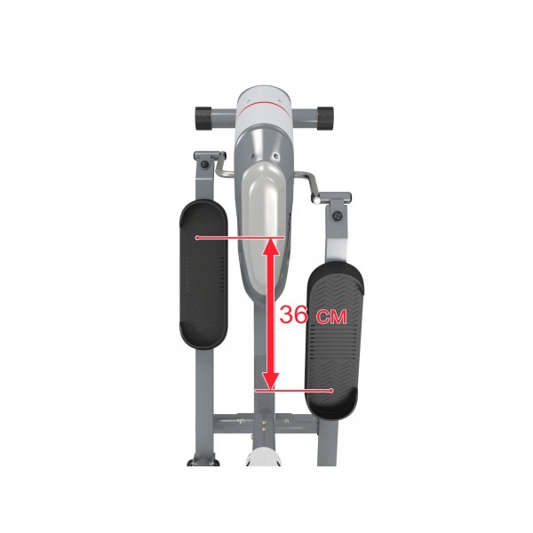 В основе конструкции магнитный тип нагрузки с маховиком 11,5 кг (вес инерционный). Длина шага, по сравнению с начальной моделью, увеличена до 35 см. Педали выполнены из антискользящего материала. Показатели пульса считывают датчики на поручнях.