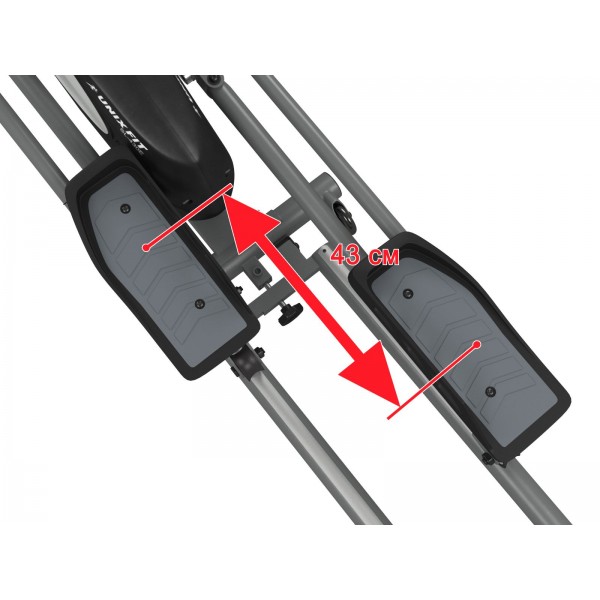 Конструкция использует магнитный тип нагрузки с маховиком 8 кг (вес реальный). Длина шага в этом тренажере 43 см, а интервал между педалями 18 см. Удобные педали имеют антискользящую поверхность. Проверку частоты пульса осуществляют датчики на поручнях.