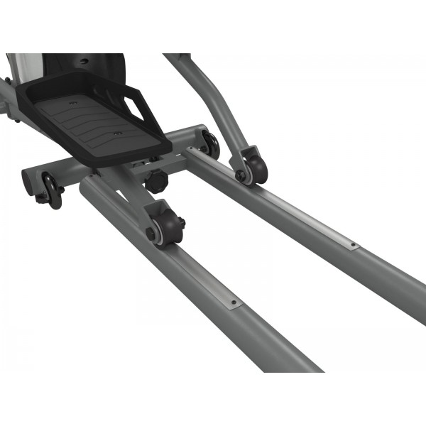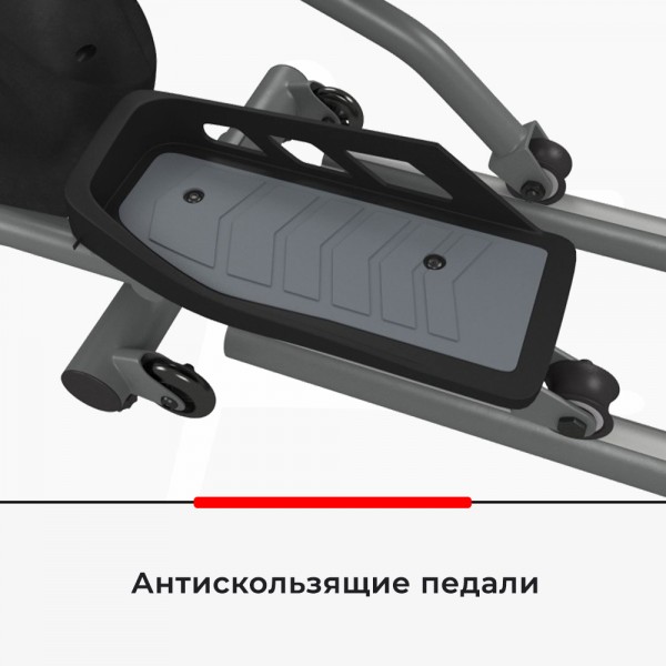 Модель использует магнитный тип нагрузки с маховиком 14,8 кг (вес инерционный). Длина шага в этой конструкции 43 см, а интервал между педалями (Q-фактор) 19 см. Поверхность педалей сделана антискользящей для комфорта и безопасности пользователей. Показатели частоты пульсы проверяют сенсоры на поручнях.