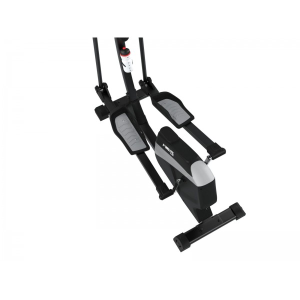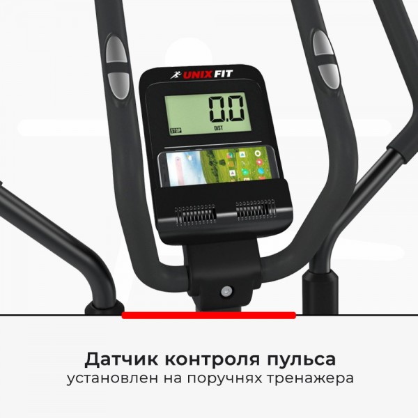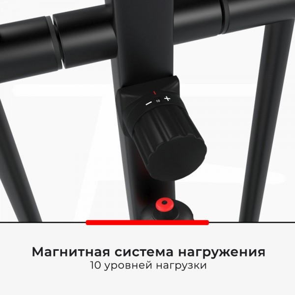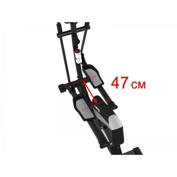 Модель использует магнитный тип нагрузки с маховиком 26 кг (вес инерционный). Длина шага здесь составляет комфортные 47 см, а интервал между педалями 18 см. Поверхность педалей не скользит и будет безопасной для тренировки. Встроенные в поручни сенсоры передадут информацию о частоте пульса на консоль.