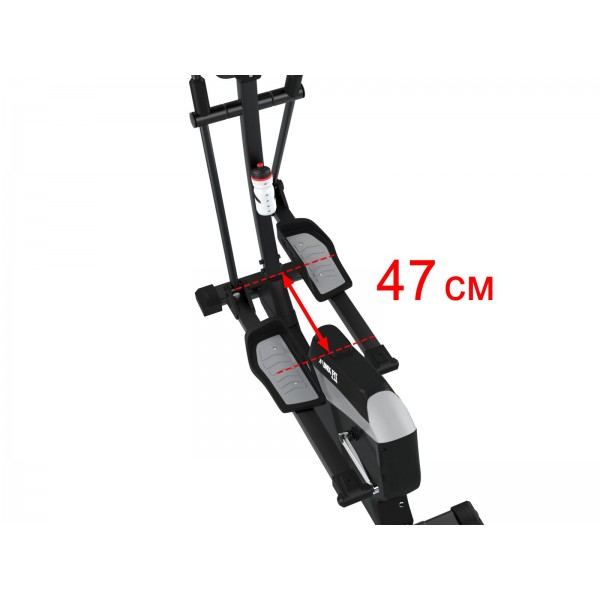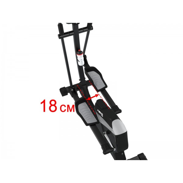 В конструкции реализован магнитный тип нагрузки с маховиком 26 кг (вес инерционный). Интервал между педалями составляет 18 см, а длина шага - 47 см. Педали будут безопасными за счет антискользящего покрытия. Встроенные сенсоры на поручнях снимают информацию о частоте пульса.