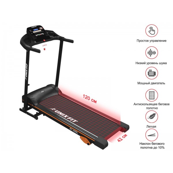 Unixfit ST-550L – беговая дорожка с комфортными размерами полотна для пользователей весом до 120 кг. Домашний тренажер надежной конструкции с программным модулем.