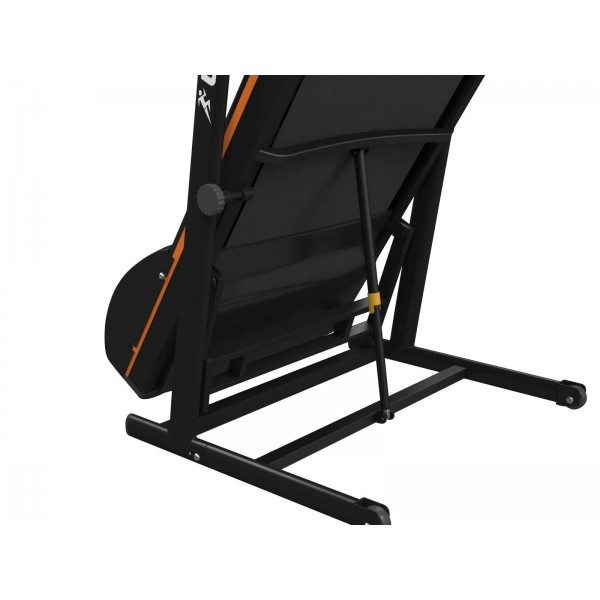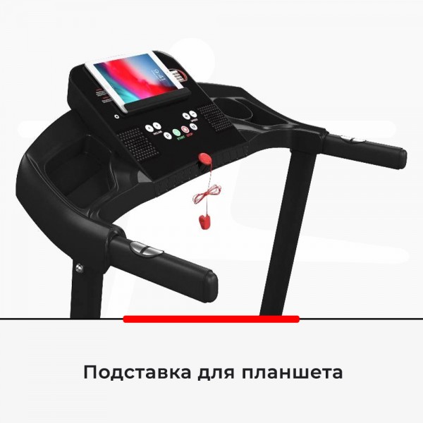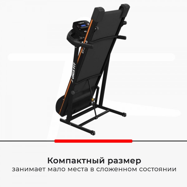 Двигатель модели имеет пиковую мощность в 2 л. с. для скорости движения спортсмена до 12 км/ч. Размер полотна 120х42 см будет удобен и для ходьбы, и для бега людям среднего роста. Наклон может быть увеличен на 15 процентов кнопками на панели управления. Дорожку можно компактно сложить.