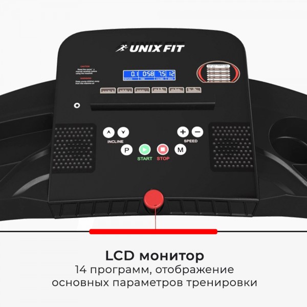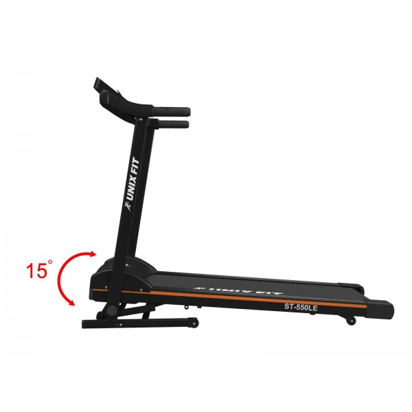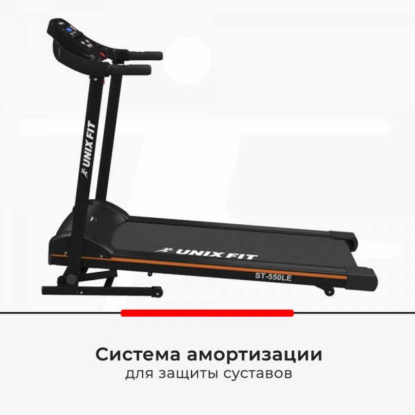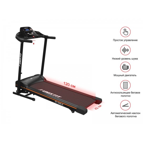 Unixfit ST-550LE – беговая дорожка с электронной регулировкой наклона полотна для пользователей весом до 120 кг. Тренажер надежной конструкции с программным блоком для домашних нагрузок.