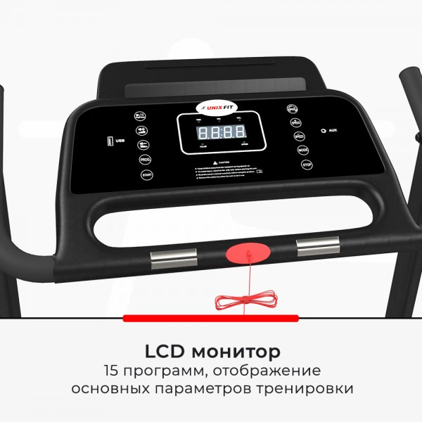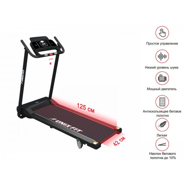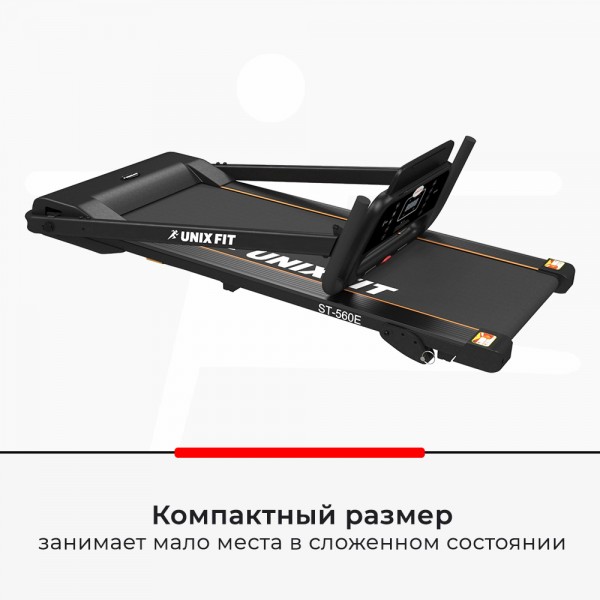 Unixfit ST-560E black – беговой тренажер с удобными компактными размерами полотна для спортсменов весом до 120 кг. Дорожка предназначена для домашней установки. Выпускается в двух цветах корпуса, этот вариант - в черном.
