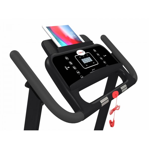 Установлен надежный двигатель с пиковой мощностью в 2,5 л. с., он обеспечивает движение на скорости до 14 км/ч. Ширина двухслойного полотна 42 см. Наклон меняется до 10 %, есть 3 положения, переключение механическое. Контроль пульса выполняют датчики на поручнях. Защиту суставам обеспечивает встроенная амортизация. Дорожку можно легко сложить.