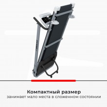 Установлен надежный двигатель с пиковой мощностью в 2,5 л. с., он обеспечивает движение на скорости до 14 км/ч. Ширина двухслойного полотна 42 см. Наклон меняется до 10 %, есть 3 положения, переключение механическое. Контроль пульса выполняют датчики на поручнях. Защиту суставам обеспечивает встроенная амортизация. Дорожку можно легко сложить.