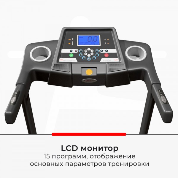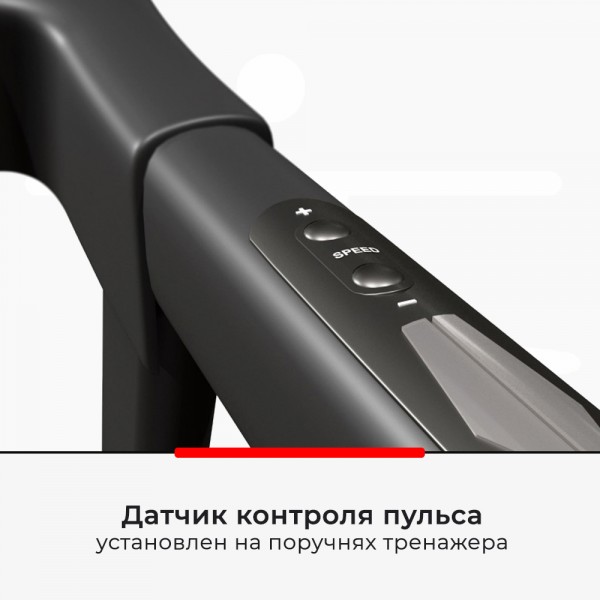 Модель работает на двигателе с шумоподавлением и пиковой мощностью в 2,8 л. с. На дорожке можно бежать со скоростью до 14,8 км/ч, при этом специальные элементы амортизации позаботятся о здоровье суставов и позвоночника. Наклон менять механически (3 варианта). Показатели пульса передают сенсоры на поручнях, там находятся и кнопки быстрого изменения скорости. Есть система компактного складывания.