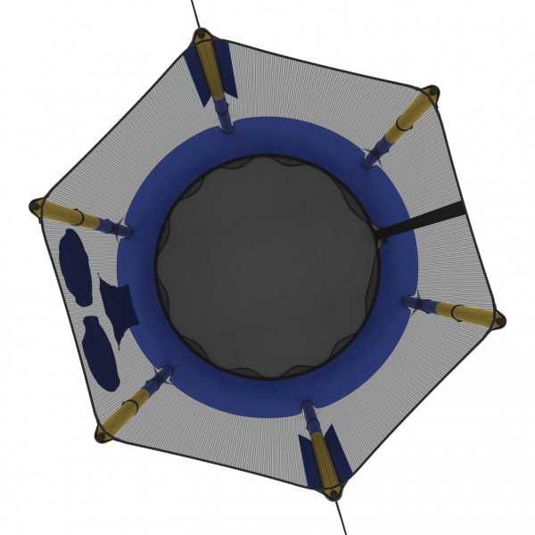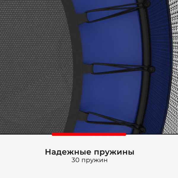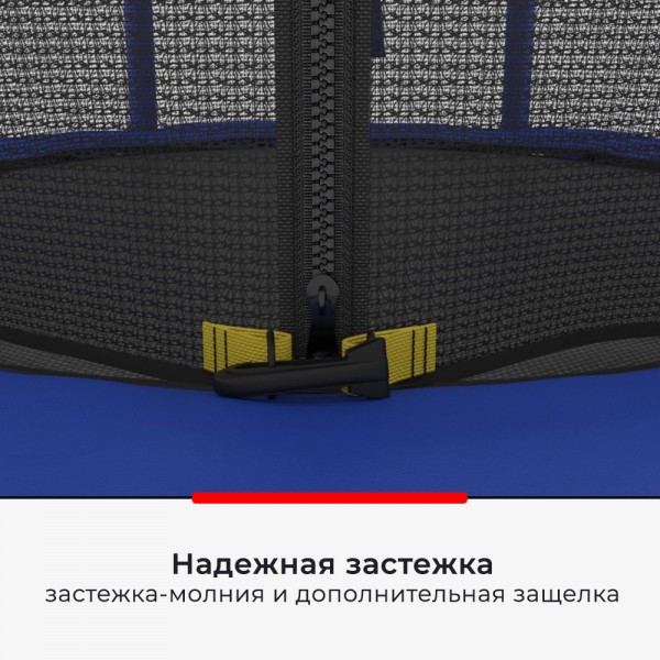 Основу конструкции составляет надежный стальной каркас с покраской в два слоя, прыжковое полотно из перматрона фиксируется эспандерными жгутами. Защитная сеть имеет затсежку-молнию.