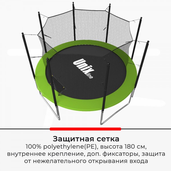 Батут Unixfit line Simple - надежный батут с защитной сеткой в базовой комплектации, который отличает простая сборка и яркий дизайн.