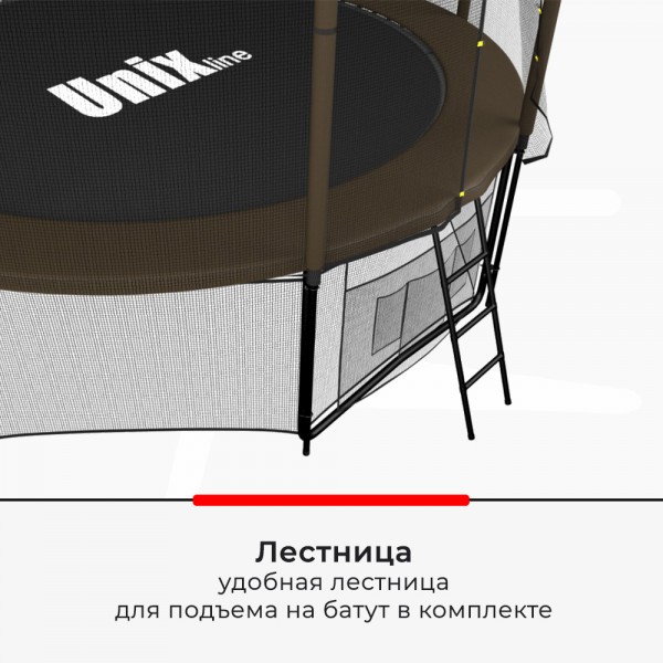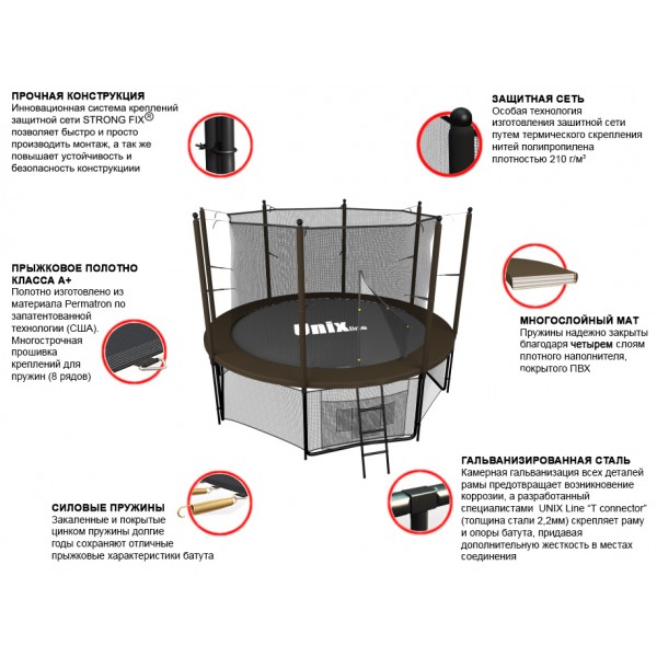 Батут Unixfit Black&Brown - современный батут с улучшенными креплениями и оригинальным цветовым решением. Модель изготовлена по стандартам ISO 9001 и выдерживает эксплуатацию при любых погодных условиях. Предлагаемое цветовое решение отлично впишется в природный ландшафтный дизайн. Есть крепления к земле.