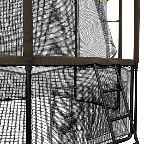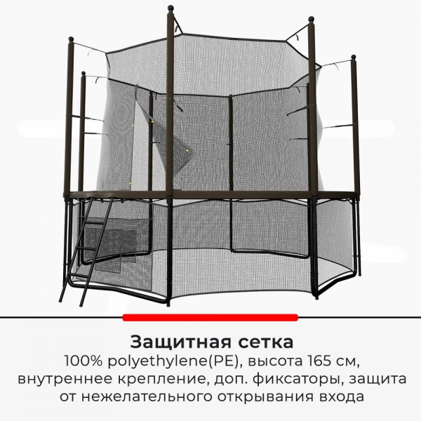 Батут использует высокопрочную раму из гальванизированной стали, для фиксации выбрана система с T-коннекторами (сталь 2,2 ммм). Для крепления стоек защитной сетки выбрана система Strong Fix, а опоры окрашены в два слоя порошковым способом. Прыжковое полотно изготовлено из прочного перматрона. Защитная сеть предотвратит попадание под батут различных предметов, мелких животных и детей (в комплекте). Также прилагается удобная лестница.