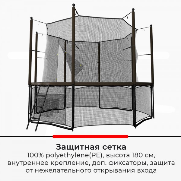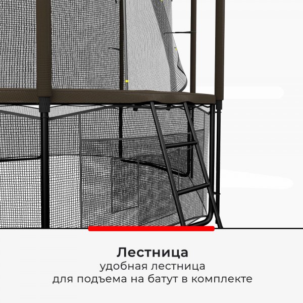 Батут использует высокопрочную раму из гальванизированной стали, для фиксации выбрана система с T-коннекторами (сталь 2,2 ммм). Для крепления стоек защитной сетки выбрана система Strong Fix, а опоры окрашены в два слоя порошковым способом. Прыжковое полотно изготовлено из прочного перматрона. Защитная сеть предотвратит попадание под батут различных предметов, мелких животных и детей (в комплекте). Также прилагается удобная лестница.