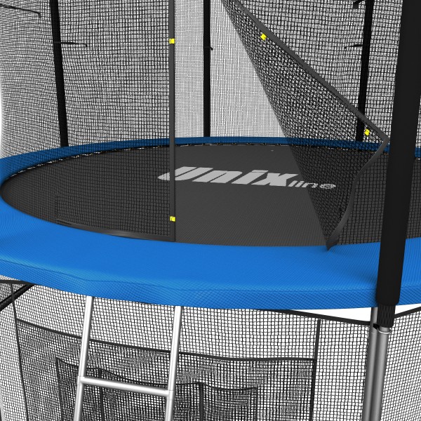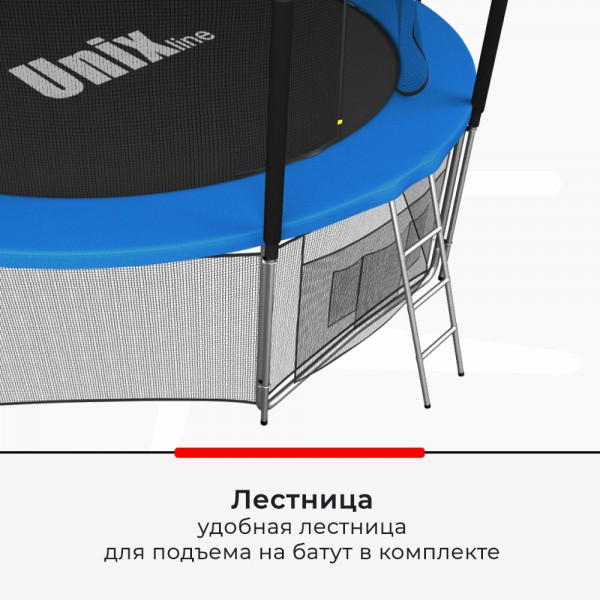 Батут Unixfit line Classic - современный батут с надежной защитой и удобной лестницей, который полностью соответствует стандартам ISO 9001 и подходит для эксплуатации при любой погоде. Двусторонняя модель с сине-зеленой отделкой.