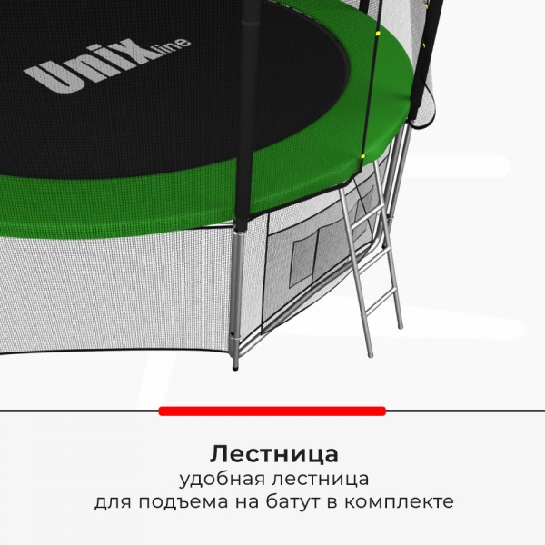 Батут Unixfit line Classic - современный батут с надежной защитой и удобной лестницей, который полностью соответствует стандартам ISO 9001 и подходит для эксплуатации при любой погоде. Двусторонняя модель с сине-зеленой отделкой.