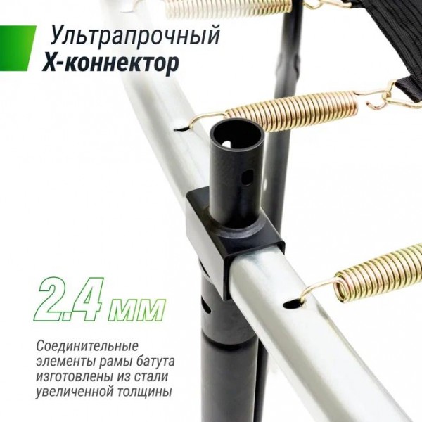 Батуты этой серии созданы по стандарту ISO 9001 и легко переносят любую погоду. Надежный стальной каркас и система креплений X-connector. Конструкция включает качественный защитный мат, верхнюю сеть, карман для обуви, а также удобную лестницу.