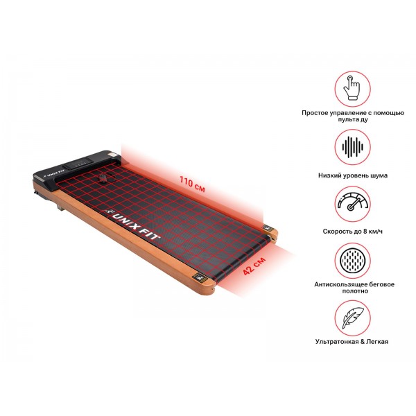 Тренажер не имеет поручня, поэтому его размеры компактны (толщина всего 12 см!) и подойдут для небольшого помещения. Сочетание максимальной скорости 8 км/ч и длины полотна 110 см позволяет рекомендовать эту модель для оздоровительной ходьбы и легкого бега людям среднего роста. Модель имеет систему амортизации.