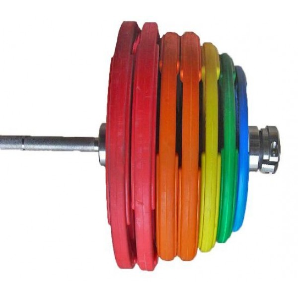 Штанга V-SPORT имеет "олимпийский" посадочный размер для дисков. В комплект включены 14 дисков (точные веса перечислены в характеристиках), они прорезиненные и окрашены в яркие цвета. Гриф может выдержать до 318 кг.